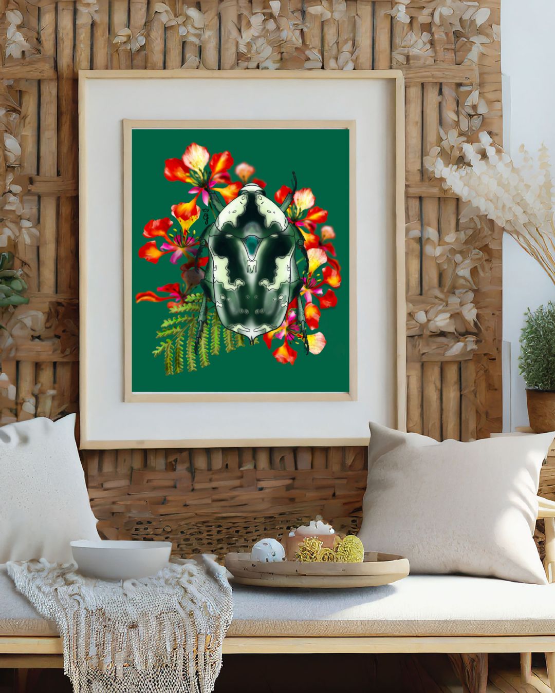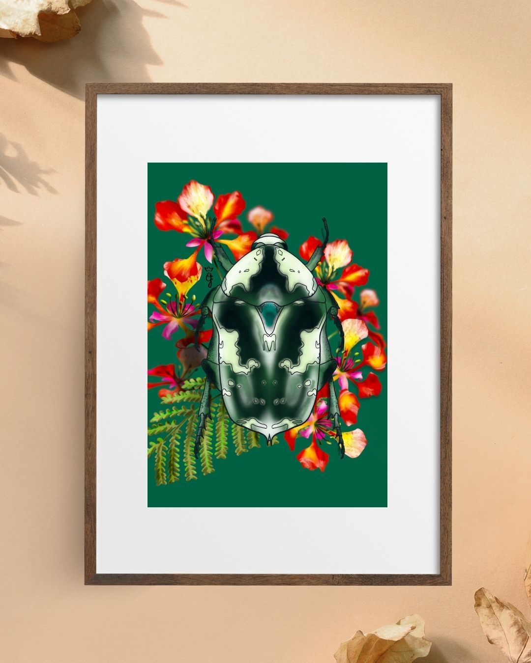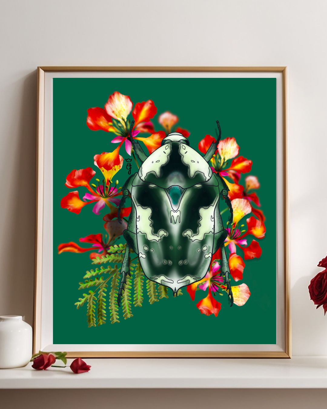 Comme une goutte de rosée sur un pétale de flamboyant, la bèbête l'argent ou Protaetia aurichalcea est la pépite inattendue de la forêt. Son corps aux reflets métalliques contraste avec la délicatesse des fleurs, créant une scène d'une rare poésie.