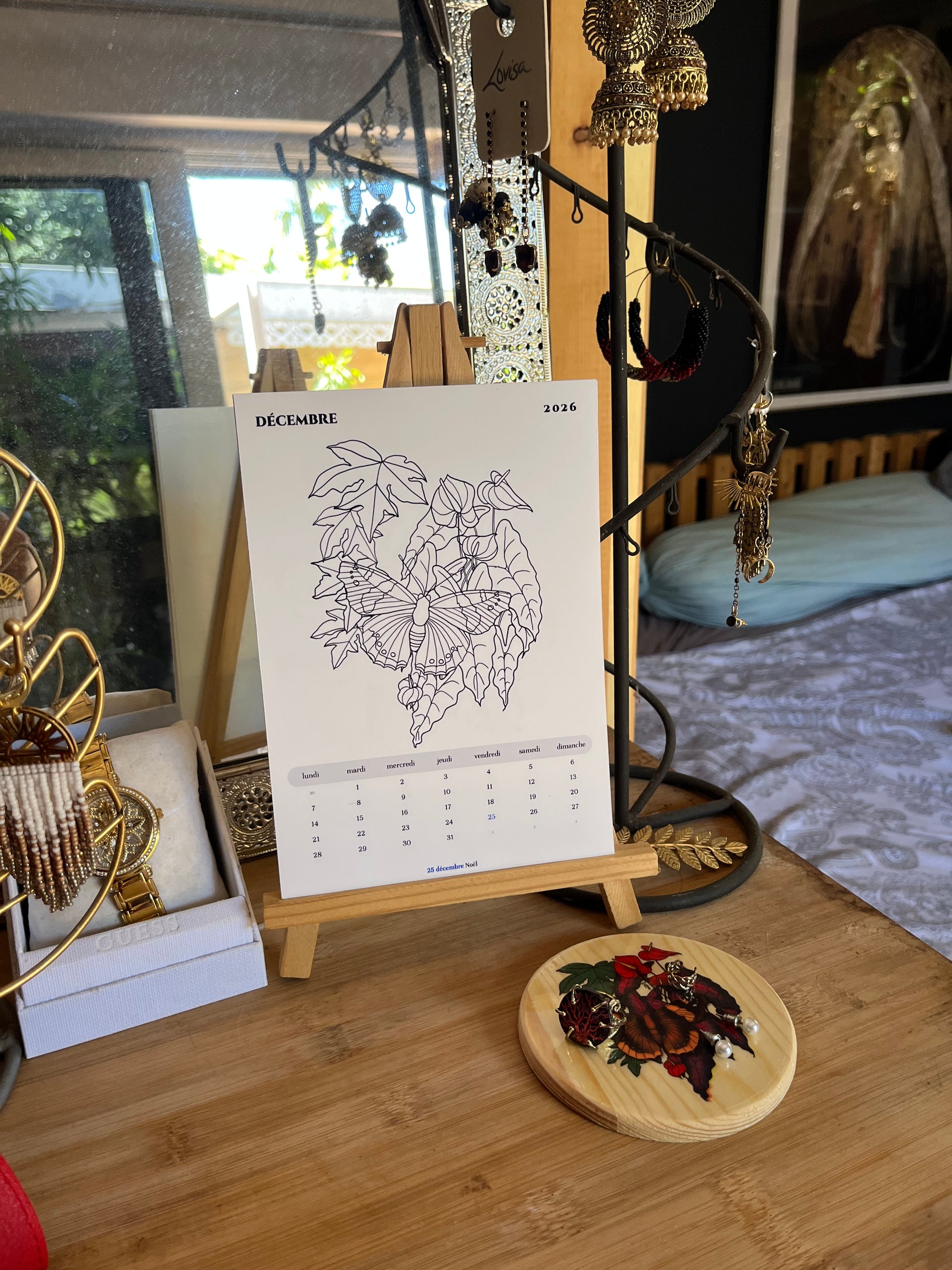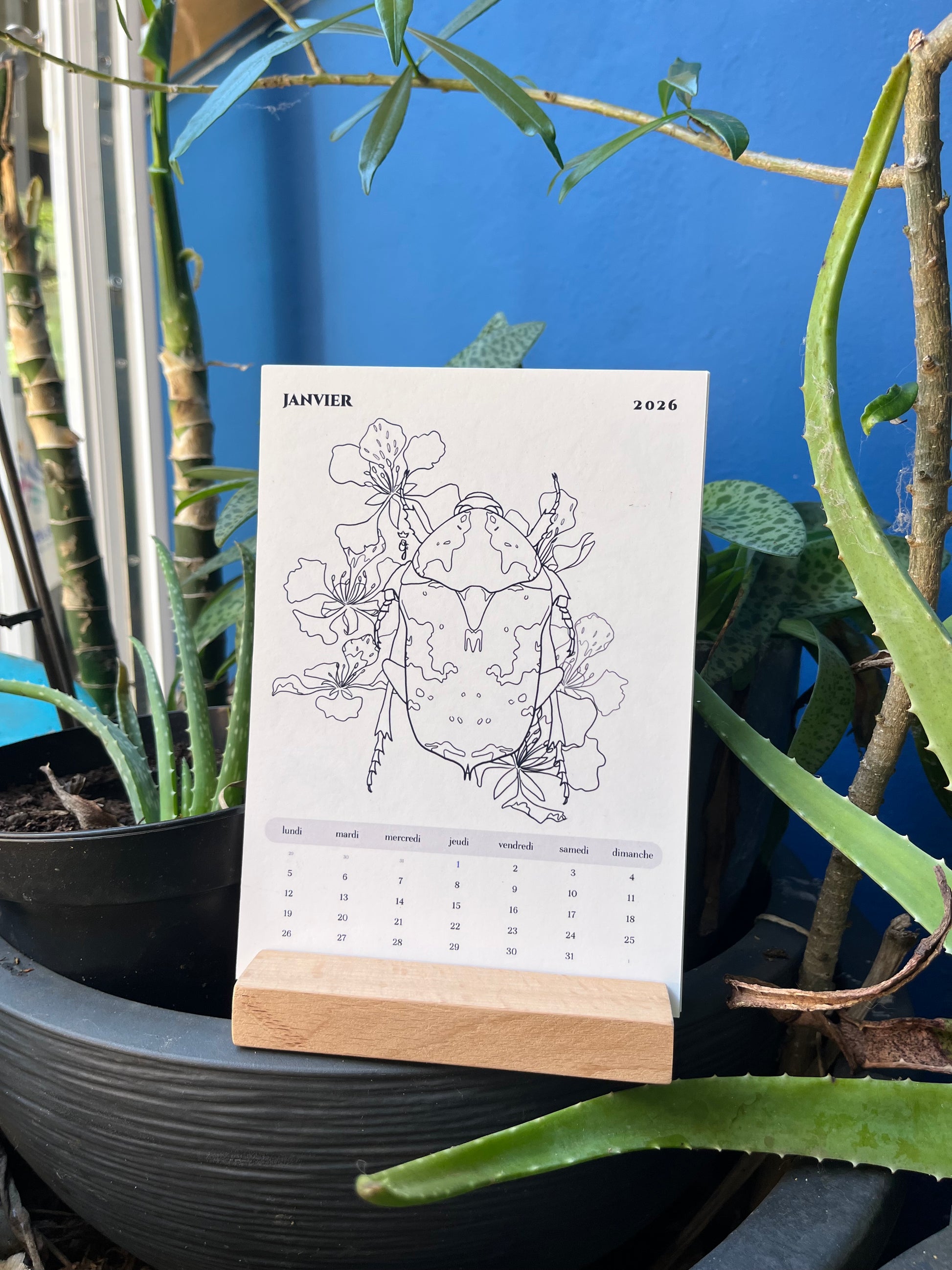 Le Calendrier à poser : Simplement posé sur votre bureau, sur le plan de travail de la cuisine ou sur le rebord de la fenêtre de votre chambre. Il suit votre quotidien et vous accompagne dans vos rêveries créatives. Il est possible de commander avec un support en bois recyclé ou avec un chevalet en bois.